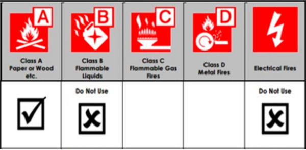 The Water and Foam extinguisher eliminates a fire by allowing water to take away the heat component of a fire while foam separates oxygen from the fire. A water extinguisher should only be used on Class A fires (Combustibles such as wood, paper, cloth, trash, and plastics).