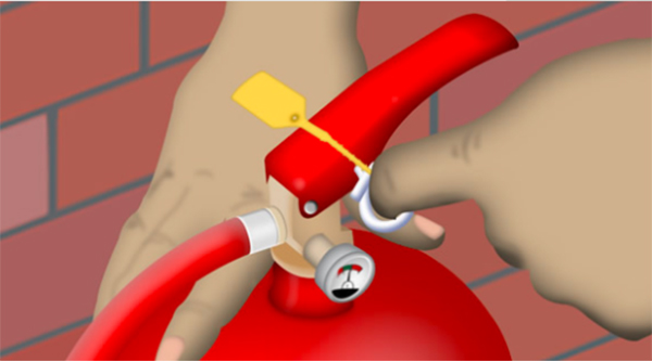 2. Ensure you remain at a safe distance from the fire and remove the safety pin, this will also break the tamper seal.